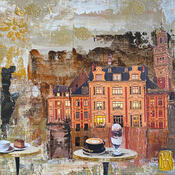 Der Künstler verwendete Acryl, Collage auf Leinenkarton, um dieses Kleine Gemälde zum Thema "Alltagsszenen, Urban" anzufertigen.