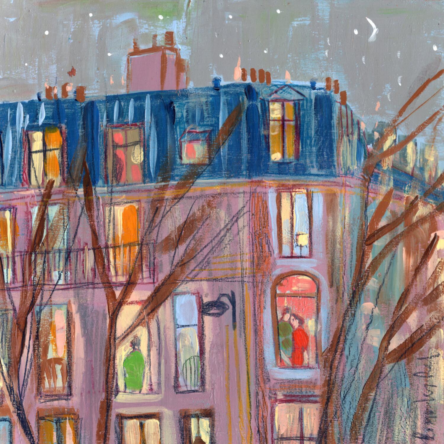 Nacht in der Stadt, die Dächer und Dachschrägen zeichnen sich unter den Lichtern ab. Die Nachbarn werden langsam aktiv. Im Hintergrund erstreckt sich die Stadt.