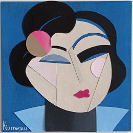 Der Künstler verwendete Acryl, Collage auf Holz, um dieses Kleine Gemälde zum Thema "Porträt" anzufertigen.