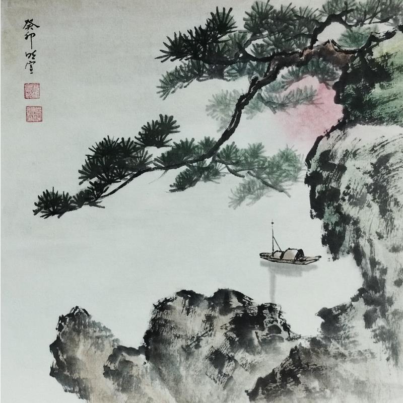 Dieses einzigartige und originale zeitgenössische Kunstwerk "Boat, pine tree and rising sun" in dem Stil "Figurativ" wurde von dem zeitgenössischen Künstler Du Mingxuan kreiert.