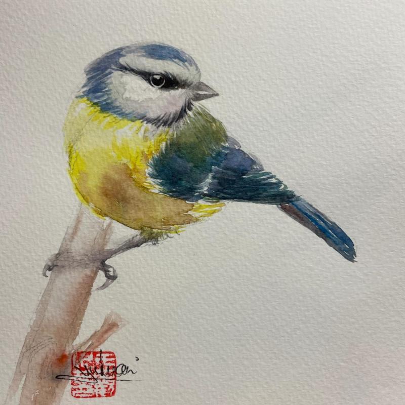 Dieses einzigartige und originale zeitgenössische Kunstwerk "Blue Tit Bird" in dem Stil "Figurativ" wurde von dem zeitgenössischen Künstler Yu Huan Huan kreiert.