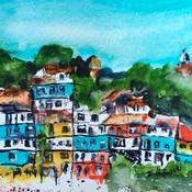 Der Künstler verwendete Aquarell auf Papier, um dieses Kleine Gemälde zum Thema "Urban" anzufertigen.