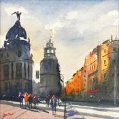 Der Künstler verwendete Aquarell auf Papier, um dieses Kleine Gemälde zum Thema "Urban" anzufertigen.