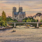 Gemälde Coucher de soleil sur Notre Dame et le pont de Sully von Decoudun Jean charles | Gemälde Figurativ Urban Aquarell