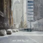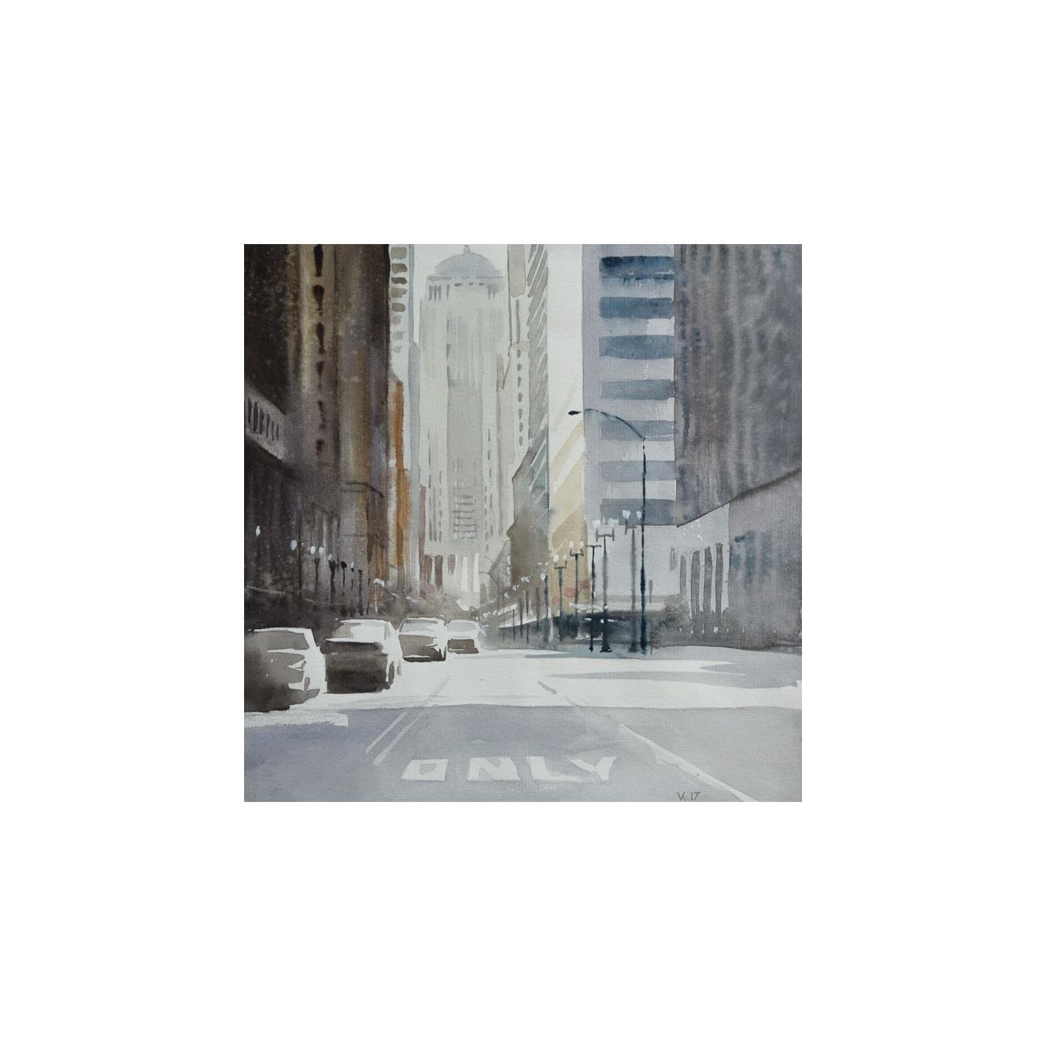 Der Künstler verwendete Aquarell, um dieses Kleine Gemälde zum Thema "Urban" anzufertigen.