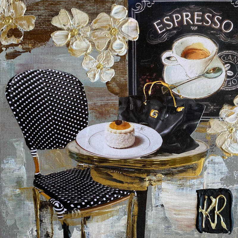 Der Künstler verwendete Collage, Acryl auf Leinenkarton, um dieses Kleine Gemälde zum Thema "Alltagsszenen" anzufertigen.