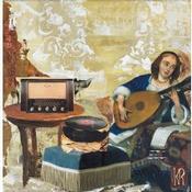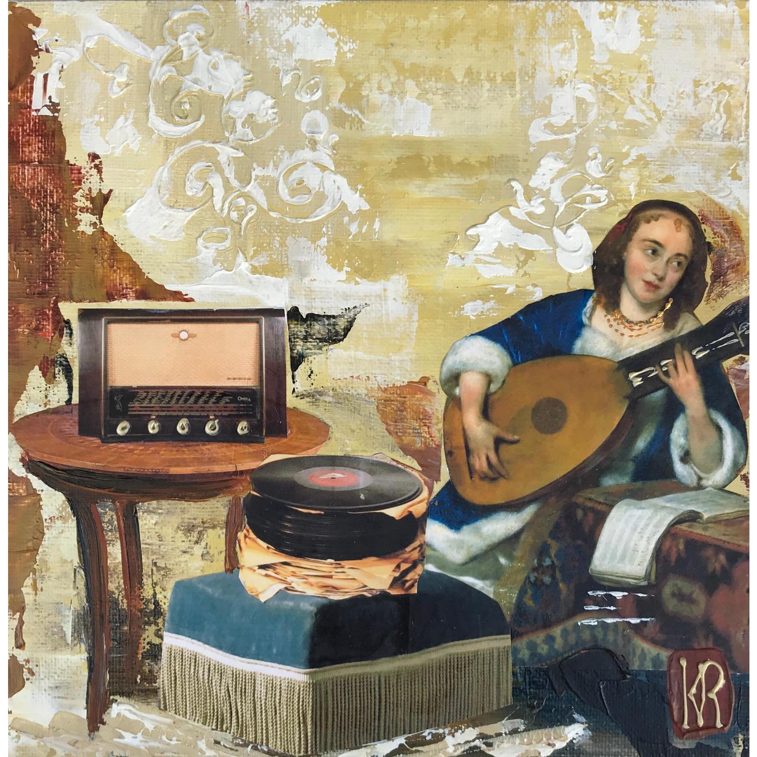 Der Künstler verwendete Collage auf Leinenkarton, um dieses Kleine Gemälde zum Thema "Alltagsszenen, Musik" anzufertigen.