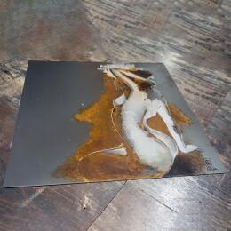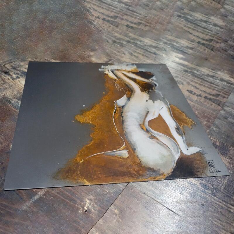 Der Künstler verwendete eine einzigartige Technik, die auf der Verwendung der Oxidation von Eisen, d. h. Rost, beruht, um dieses kleinformatige Gemälde mit seinem einzigartigen Stil zu schaffen.