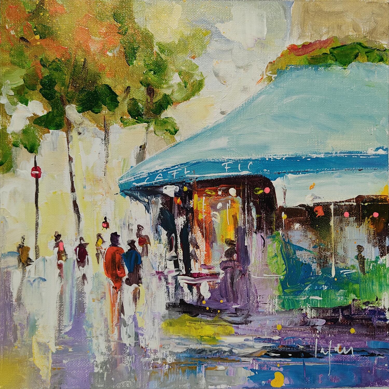 Dieses einzigartige und originale zeitgenössische Kunstwerk "Café de Flore à l'aube " in dem Stil "Figurativ" wurde von dem zeitgenössischen Künstler Yavru Irfan kreiert.