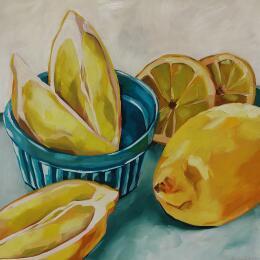 Es liegt eine seltsame Schönheit in der Art, wie Zitronen sich selbst halten - hell, ruhig und entschlossen. Am Anfang dieses Gemäldes stand eine Erinnerung: in der Küche zu stehen und mit langsamen Fingern Zitronen zu schälen, während sich der Raum mit weichem Morgenlicht füllte. Es geht nicht nur um Obst. Es geht um Rhythmus, Geduld und eine Art von heiliger Wiederholung.