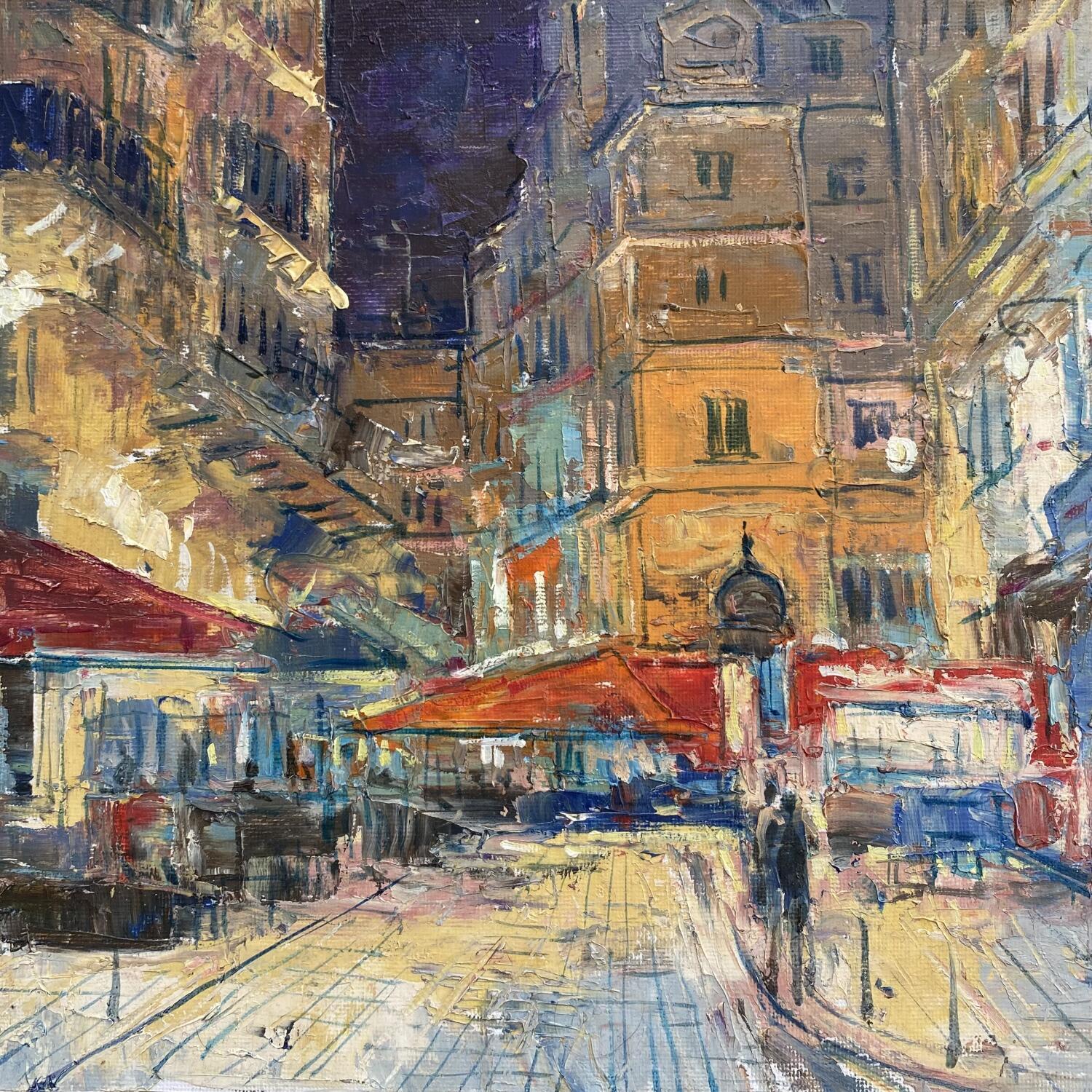 Der Künstler verwendete Öl auf Leinwand, um dieses Kleine Gemälde zum Thema "Urban" anzufertigen.