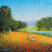 Dieses einzigartige und originelle zeitgenössische Kunstwerk „La nostalgie des coquelicots“ (Die Nostalgie der Mohnblumen) wurde vom zeitgenössischen Künstler Dessapt Elika geschaffen. Der Künstler verwendete Acrylfarben und Sand, um dieses kleinformatige Gemälde im impressionistischen Stil auf Leinwand zu schaffen.
