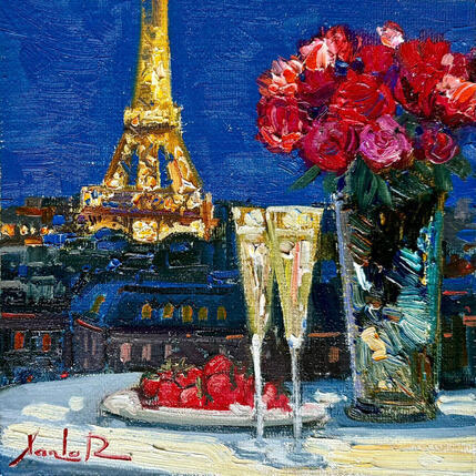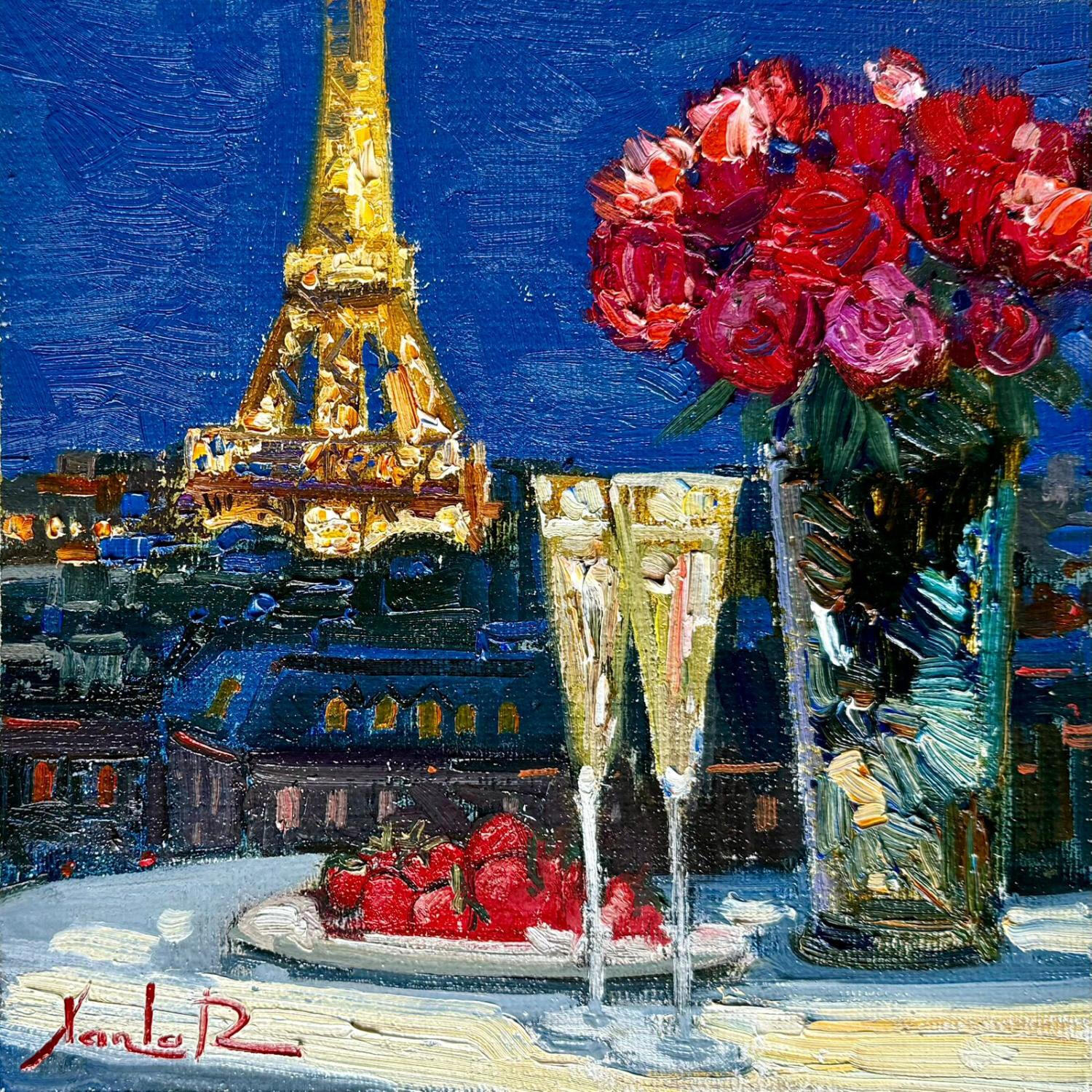 Dieses einzigartige und originelle zeitgenössische Kunstwerk „F3 „Champagne and Roses, Paris“ 107-21551-20251016-17“ wurde vom zeitgenössischen Künstler Xanlar geschaffen. Der Künstler verwendete Ölfarbe auf Leinwand, um dieses figurative, kleinformatige Gemälde zu schaffen.