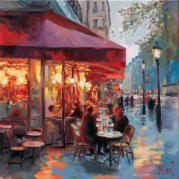 "The Light of France" zeigt die gemütliche Wärme eines Cafés in einer charmanten alten französischen Stadt. Leuchtende Lichter strahlen auf die Straße hinaus und schaffen eine einladende Atmosphäre, die Menschen an kleinen Tischen unter einer lebhaften Markise zusammenführt. In satten Rot- und Goldtönen und sanften Blautönen gemalt, zelebriert diese Szene das einfache Vergnügen, Gespräche und Momente in einer zeitlosen Umgebung zu teilen.