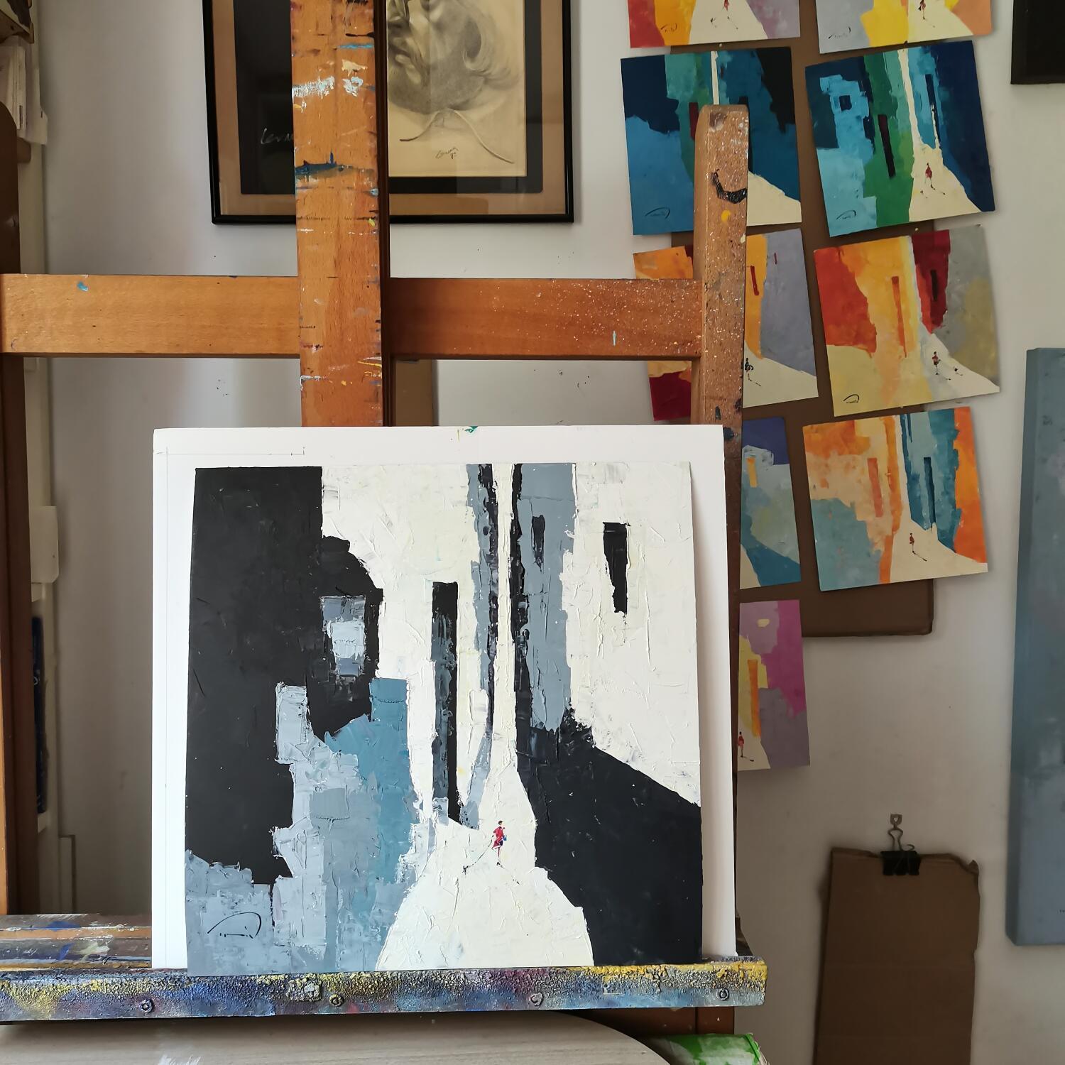 Der Künstler verwendete die Öltechnik, um dieses kleinformatige Gemälde auf Papier im Stil des Impressionismus mit dem Thema Schwarz & Weiß zu schaffen.
