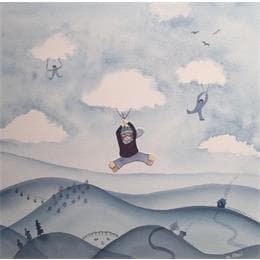 Dieses einzigartige und originale zeitgenössische Kunstwerk "Camille dans les nuages" in dem Stil "Naive Kunst" wurde von dem zeitgenössischen Künstler Marjoline Fleur kreiert.