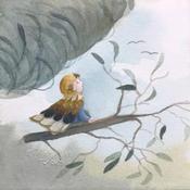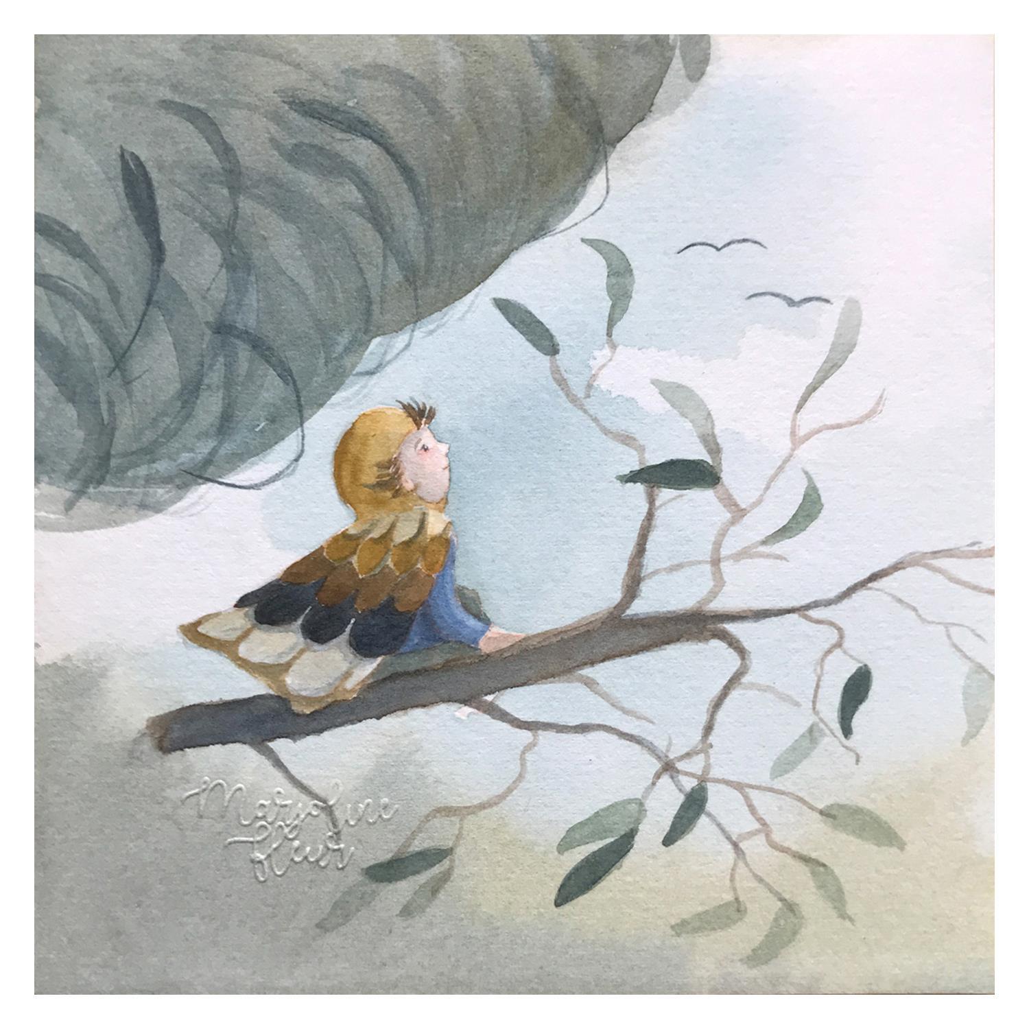 Die Künstlerin verwendete die Technik des Aquarells, um dieses kleinformatige Gemälde im Stil der naiven Kunst auf Papier zu schaffen.