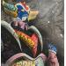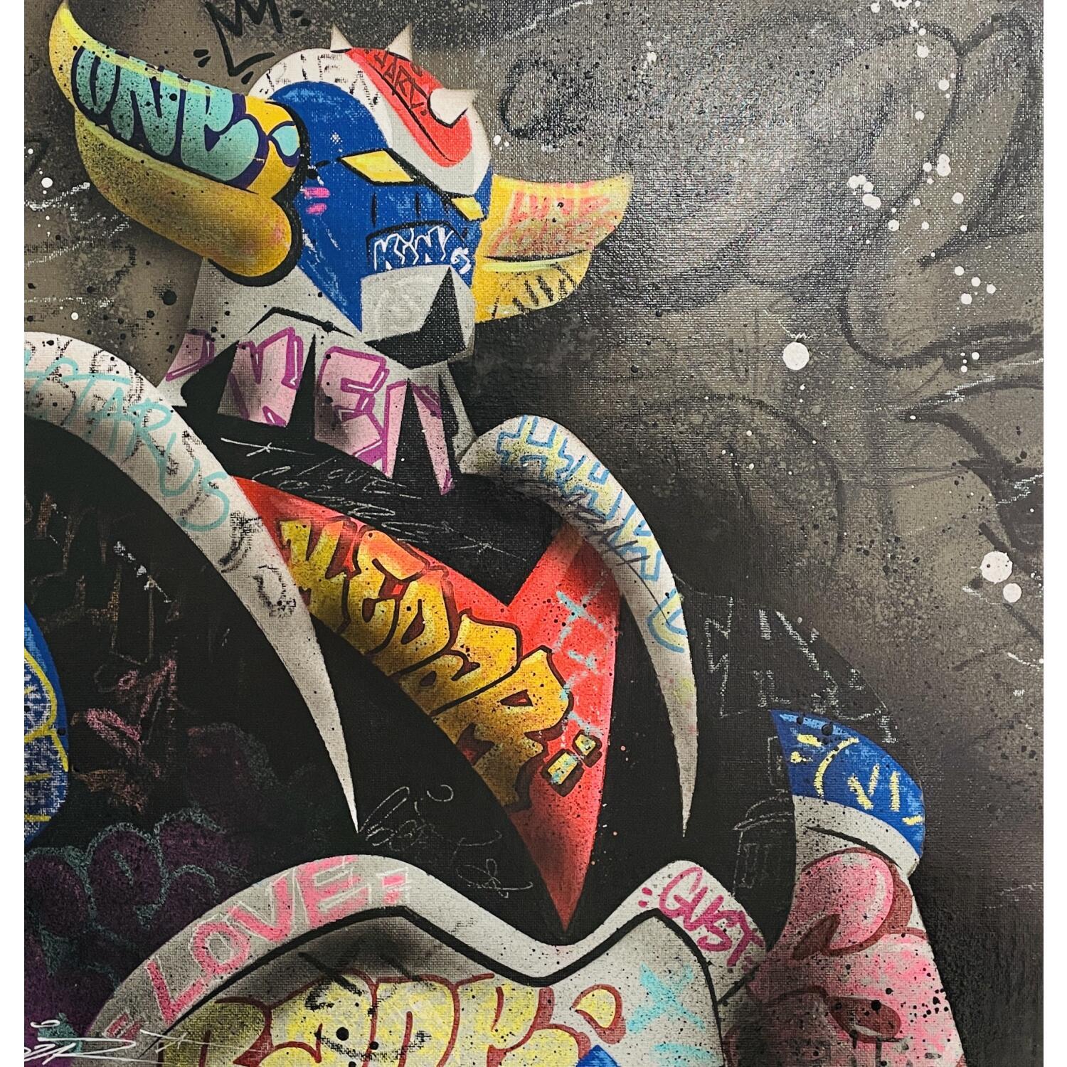 Der Künstler verwendete Acryl, Graffiti auf Leinenkarton, um dieses Kleine Gemälde zum Thema "Pop-Ikonen" anzufertigen.