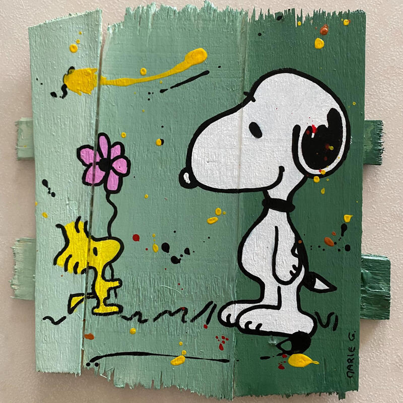 Die Künstlerin verwendete Acrylfarben, um dieses kleinformatige Gemälde auf Holz im Pop-Art-Stil zum Thema „Pop-Ikonen“ zu gestalten.