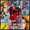 Der Künstler verwendete Acryl, Collage, Upcycling auf Leinenkarton, um dieses Kleine Gemälde zum Thema "Pop-Ikonen" anzufertigen.