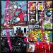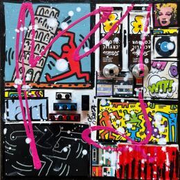 Der Künstler verwendete Acryl, Collage, Upcycling auf Leinenkarton, um dieses Kleine Gemälde zum Thema "Pop-Ikonen" anzufertigen.