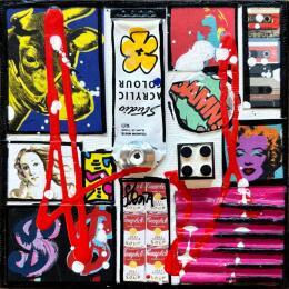 Der Künstler verwendete Acryl, Collage, Upcycling auf Leinenkarton, um dieses Kleine Gemälde zum Thema "Pop-Ikonen" anzufertigen.
