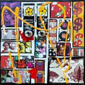 Der Künstler verwendete Acryl, Collage, Upcycling auf Leinenkarton, um dieses Kleine Gemälde zum Thema "Pop-Ikonen" anzufertigen.
