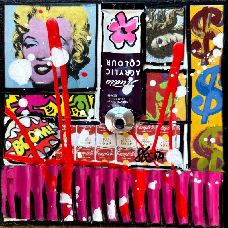 Der Künstler verwendete Acryl, Collage, Upcycling auf Leinenkarton, um dieses Kleine Gemälde zum Thema "Pop-Ikonen" anzufertigen.