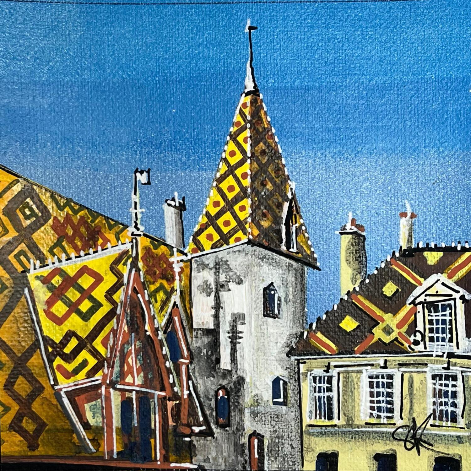 Dieses einzigartige und originale zeitgenössische Kunstwerk "Le clocher des hospices de Beaune" in dem Stil "Realismus" wurde von dem zeitgenössischen Künstler Touras Sophie-Kim kreiert.