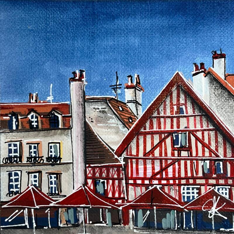 Dieses einzigartige und originelle zeitgenössische Kunstwerk „Les parasols rouges de la place du bareuzai“ (Die roten Sonnenschirme auf dem Bareuzai-Platz) wurde von der zeitgenössischen Künstlerin Touras Sophie-Kim geschaffen. Die Künstlerin verwendete die Öltechnik, um dieses kleinformatige Gemälde auf Leinwandkarton im Stil des Realismus zum Thema Stillleben zu schaffen.