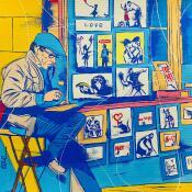 Der Künstler verwendete auf Leinwand, um dieses Kleine Gemälde zum Thema "Urban, Pop-Ikonen" anzufertigen.