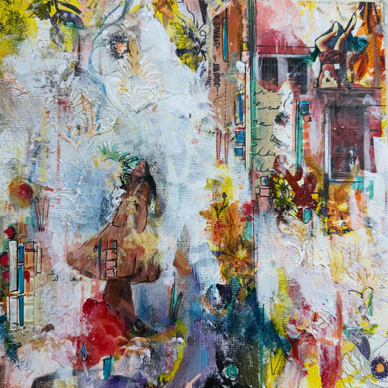 Dieses einzigartige und originelle zeitgenössische Kunstwerk im Format F2 mit dem Titel „Tout pour toi“ (Alles für dich) wurde von der zeitgenössischen Künstlerin Bergeron Marie-Josée geschaffen. Die Künstlerin verwendete verschiedene Techniken: Acrylfarbe, Texturen, Collagen, Bleistifte und andere Medien, um dieses kleinformatige Gemälde auf Leinwand im semi-abstrakten, surrealistischen Stil zu schaffen.