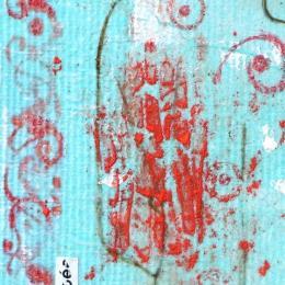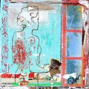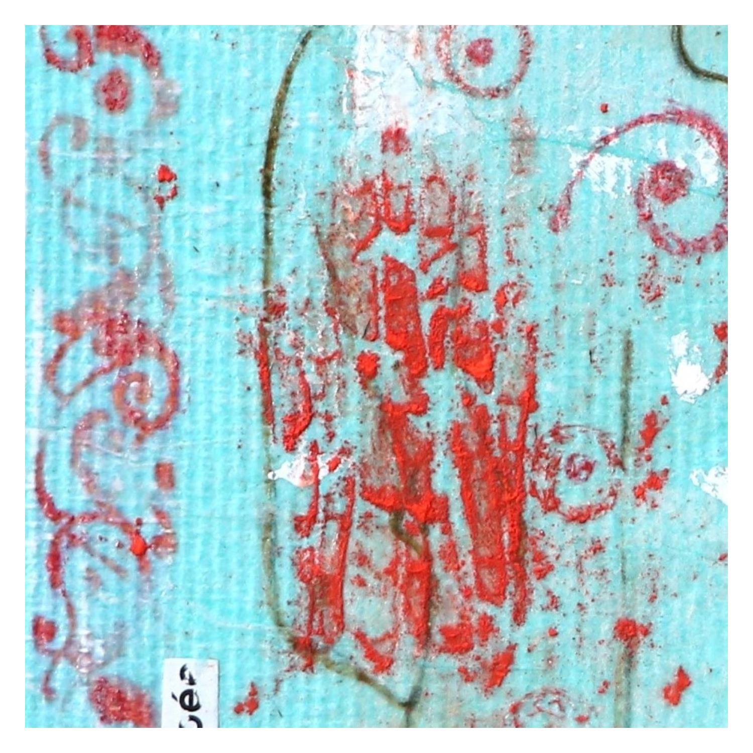 The artist used ink, acrylic, dry pastel and recycled materials to create this small-format painting on canvas on wood in the Art Singulier style.