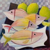 This unique and original contemporary artwork "AQ 31 Poissons et citrons" on the subject of Still-life has been created by the contemporary artist Burgi Roger.