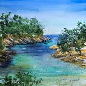 The artist used a watercolor technique to create this small-format painting on paper in a figurative style on the theme of the sea.