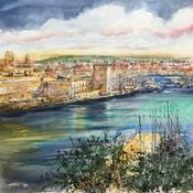 The artist used the watercolor technique to create this small-format painting on paper in a figurative style with an Urban theme.