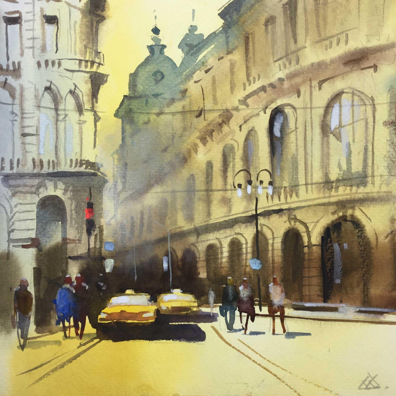 Golden hourPainting Golden hour by Khodakivskyi Vasily | Painting Figurative Urban Watercolor