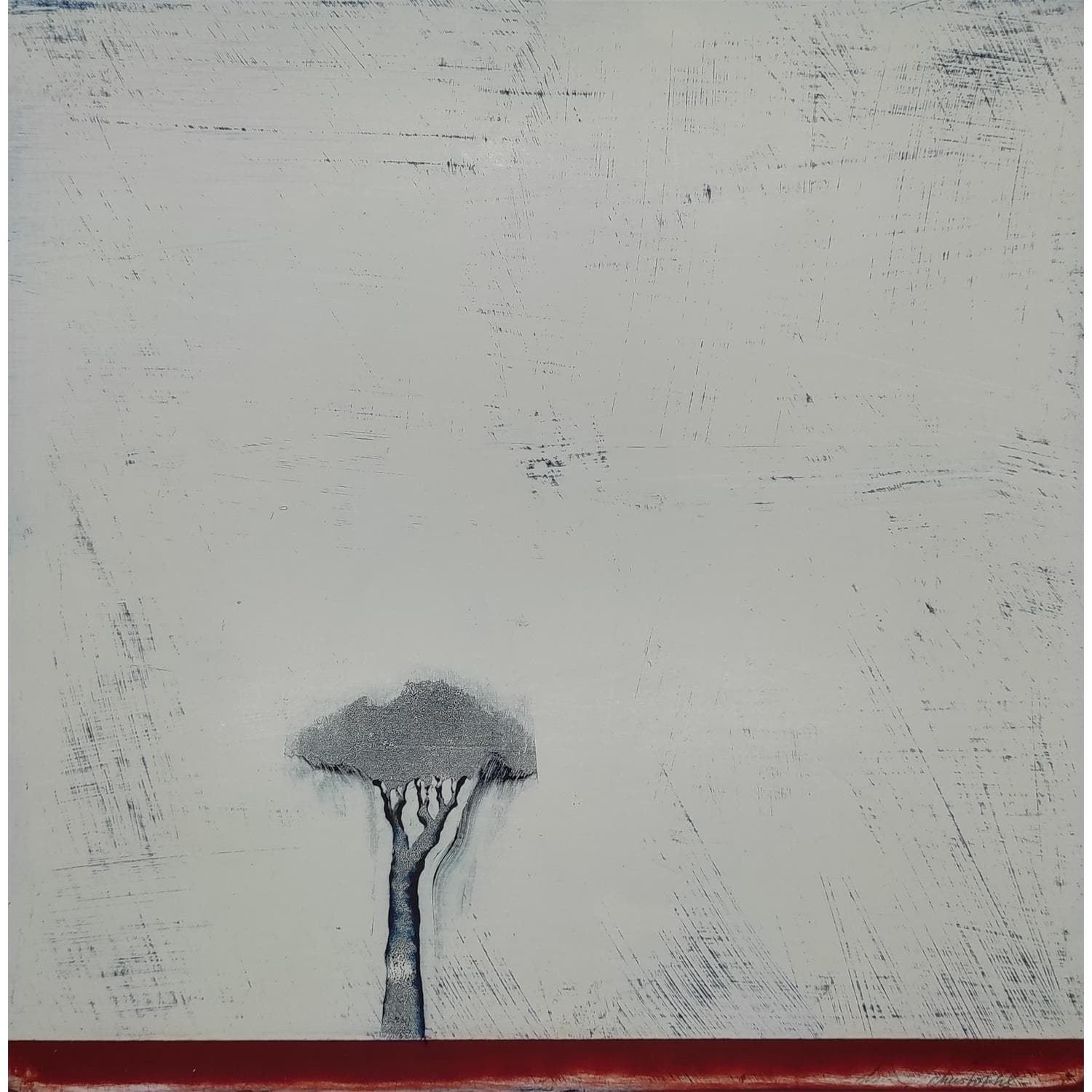 Despite the radical nature of his art, he likes to say he never repeats himself "every time is just a try," Christophl says. A photographer by trade, it is through related screen-printing technology that he, for the first time, flirted with inks and pigments. In the early 2000s, he selftaught himself monotype and adapted it for his purposes, finding a writing technique, but he remained, like so many others before him, desperately unsatisfied. So he tried a variety of media: paper, wood and finally painting while multiplying techniques: acrylic paint, ink or wax on wood or cardboard. Christophe devotes his pictorial art to landscapes. An almost abstract painting, tormented and full of matter, where one or more trees appear, marking the end of his meticulous work in homage to the vegetable kingdom.
