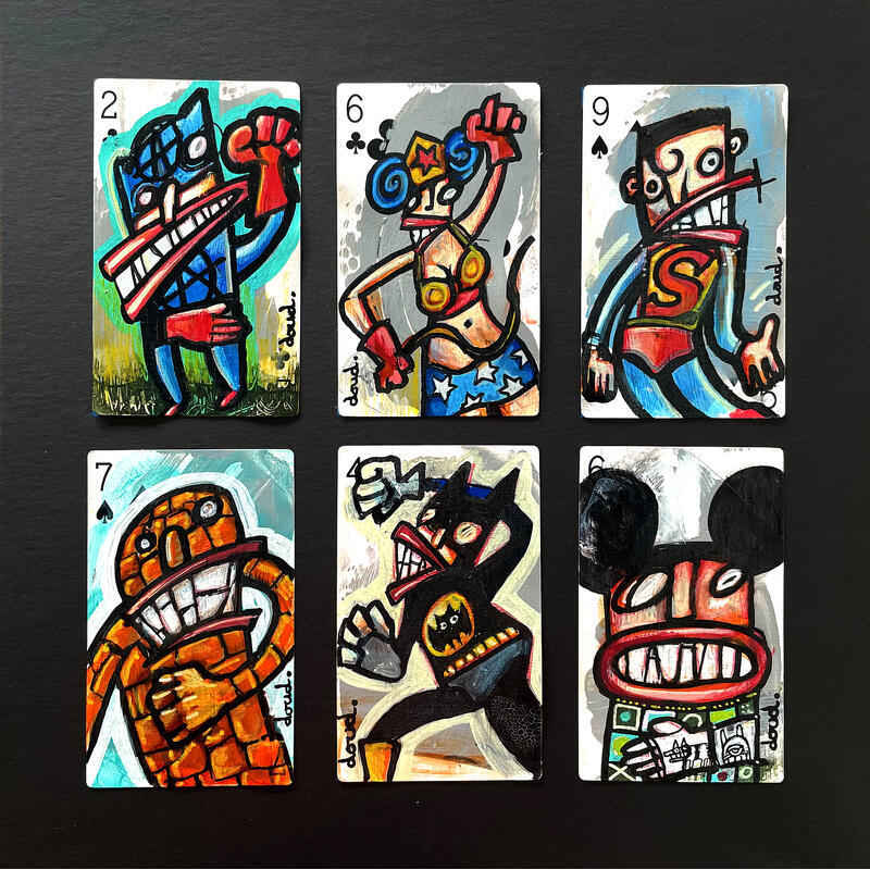The Breton Loic Tarin, aka Doudoudidon, passed the baccalaureate, then a degree in advertising graphic design. He started off creating images and illustrations, and more recently it clicked into place for him that he should start an artistic life. Influenced by his often technical and scientific readings and listening, he has long wondered about the layout of the universe, Darwinian theories, human sciences… Considering that "he knows nothing", he creates poetic, expressive and intuitive "paintings" (for him painting his first and foremost silent poetry). The idea of distortion of media is the basis of his artistic practice. He likes to use what is initially recyclable waste. He also likes to distort objects like playing cards with themes inspired by the Middle Ages.