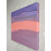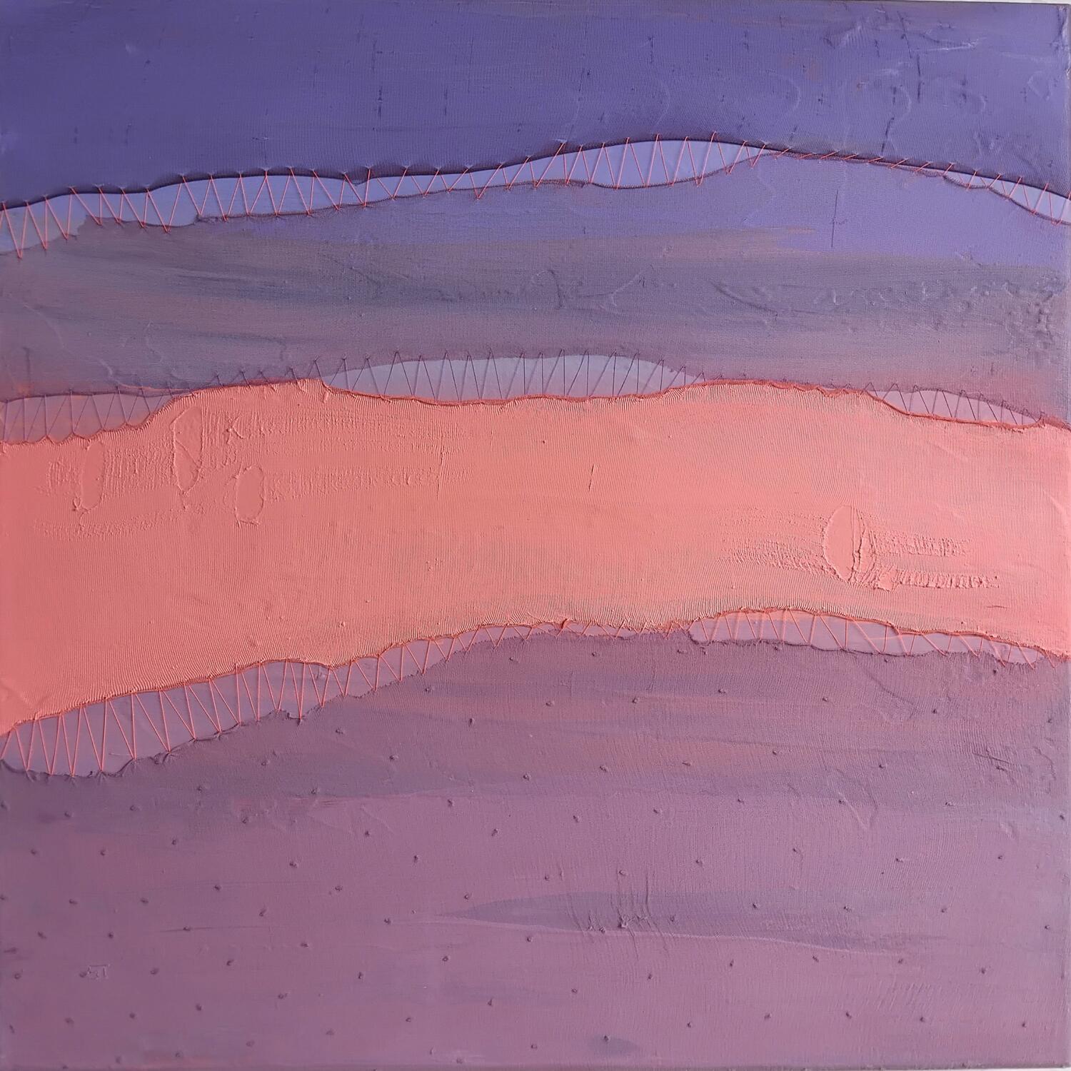 The artist mixed acrylic paint, textile and thread to create this composition on a 4 cm-thick canvas, giving the work a strong presence on the wall. The colors are inspired by a sunset in shades of orange and mauve.