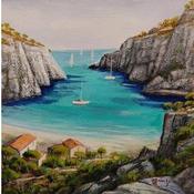 This unique and original contemporary artwork "Les cabanons de la calanque" on the subject of Landscapes has been created by the contemporary artist Burgi Roger.