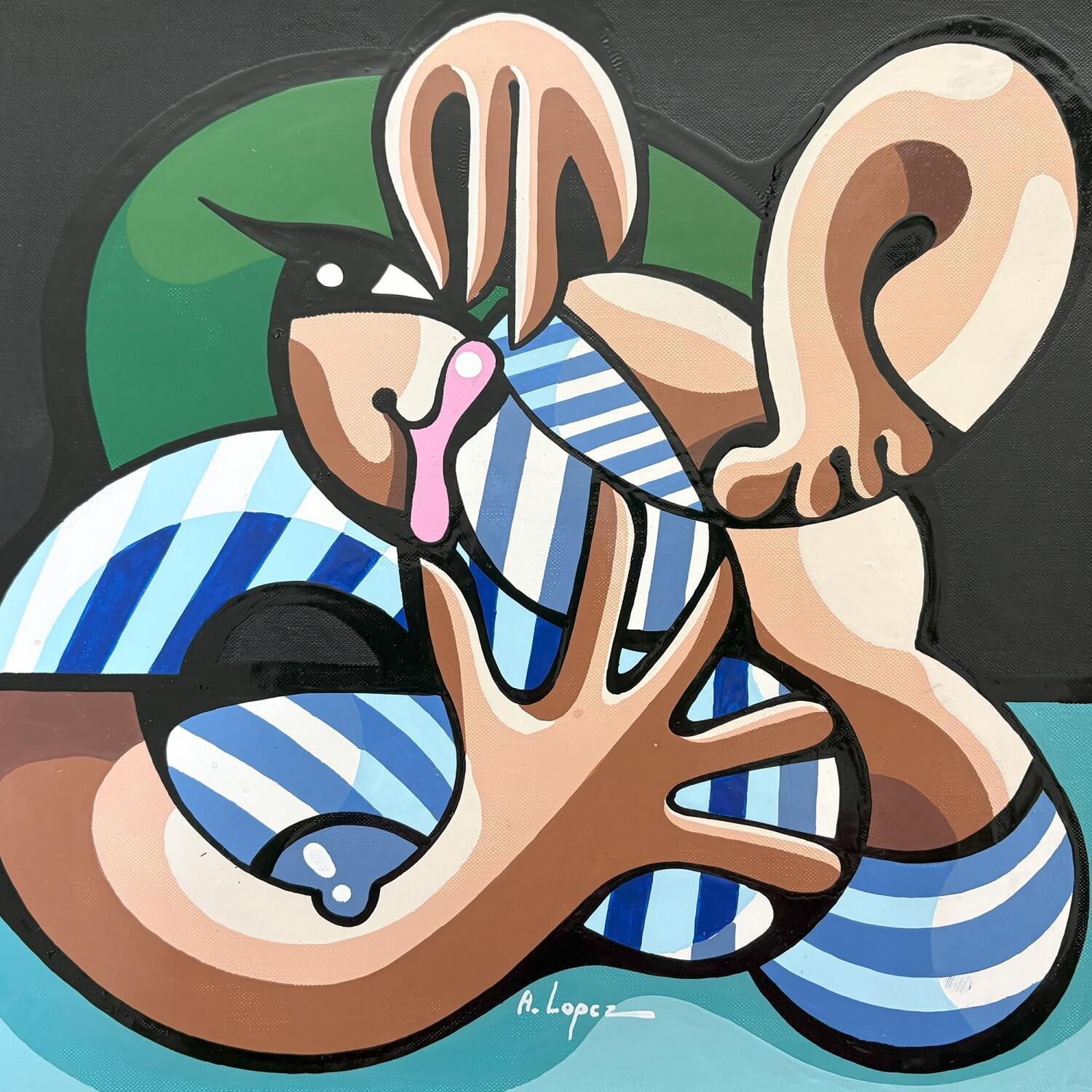 Born in 1964, Alfredo Lopez is a Bolivian-born artist who grew up in Spain before moving to Paris. Today, he lives and works near Chartres. His artistic career began in carefree times, with a vocation for freedom and sincerity. After working in advertising for fifteen years, he devoted himself fully to painting. His works, characterized by vivid colors and central characters, are narratives of everyday life, translating his neo-punk and benevolent sensibility.