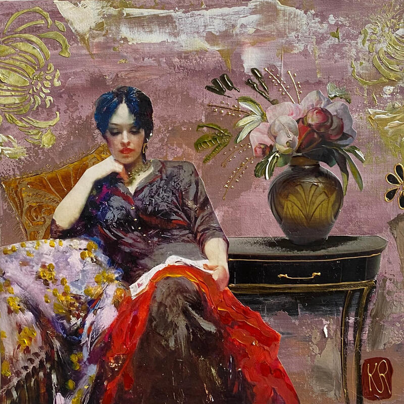 The artist used Acrylic, Gluing media on Canvas board to create this Figurative, Small size painting.