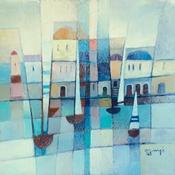 This unique and original contemporary artwork "AQ69 MARINE BLEUE" on the subjects of Marine, Landscapes, Urban has been created by the contemporary artist Burgi Roger.
