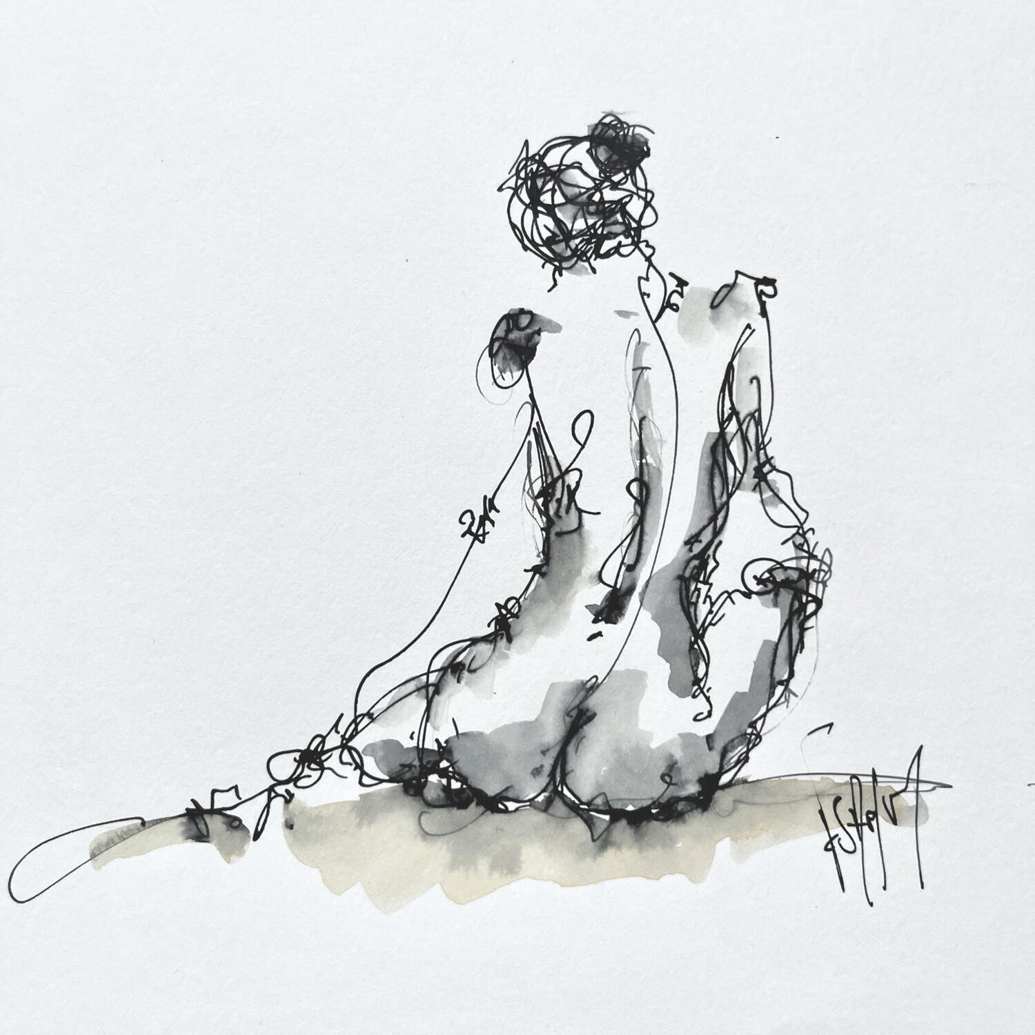 This unique and original contemporary artwork "Alice" was created by contemporary artist Sahuc François. The artist used ink and watercolor techniques to create this small-format painting on paper in a figurative style on the themes of minimalism and nudity.