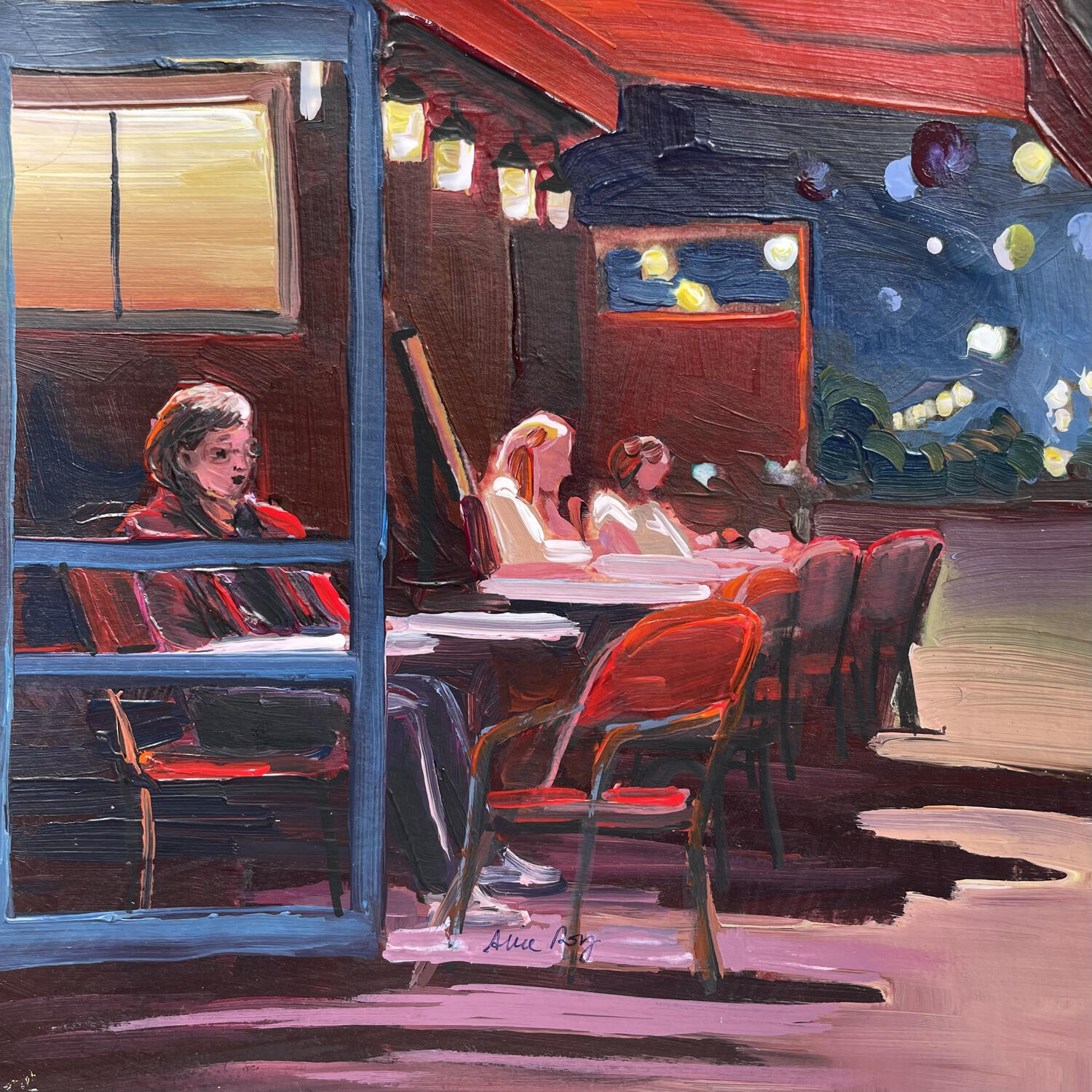 The artist used acrylic paint to create this small-format figurative painting on paper.