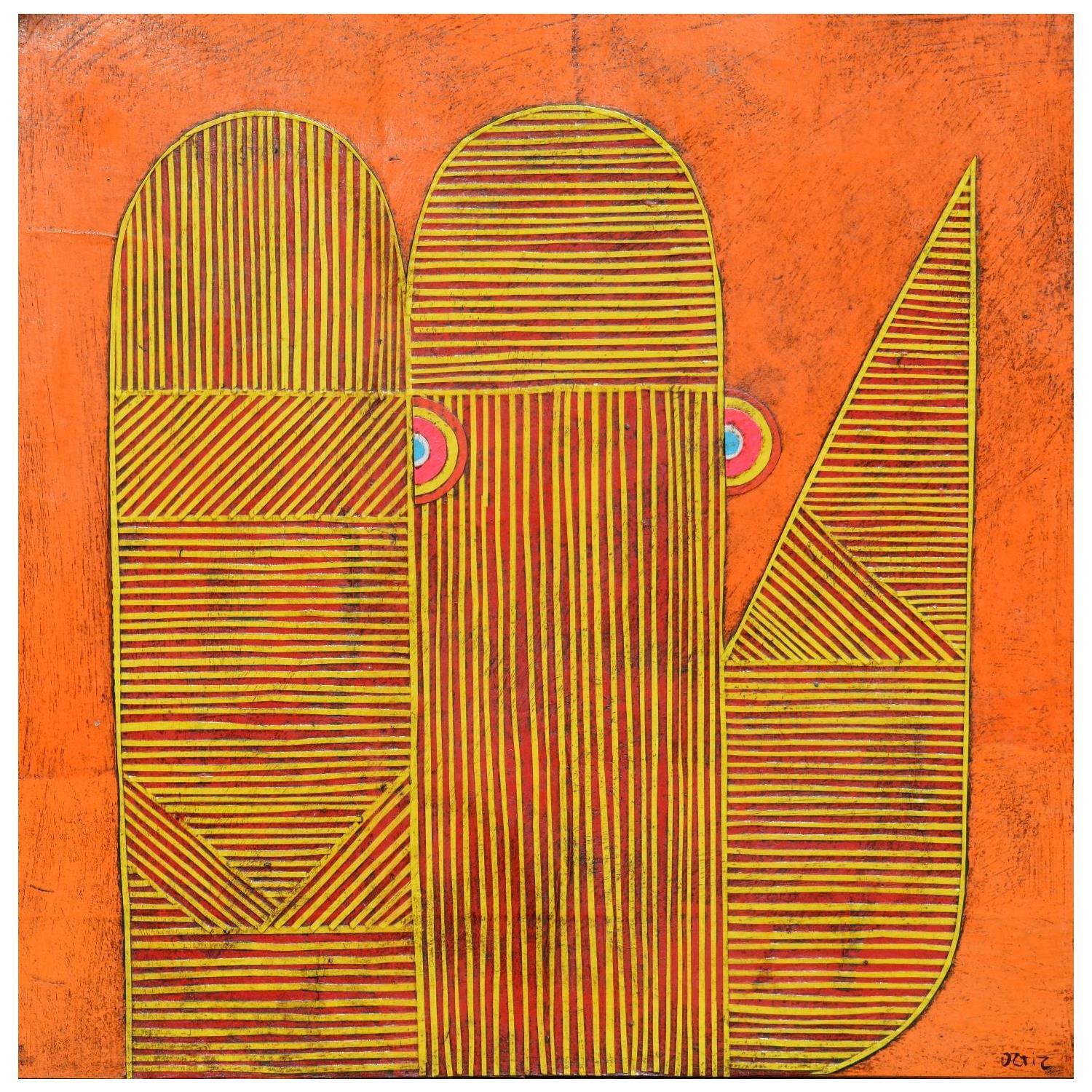 Gustavo spent his childhood in Realico, a small town lost in the Argentine Pampas. Besides the artistic activities experienced in his neighbourhood, an encounter with art would amaze and influence him; during a school trip to Buenos Aires, he attended a retrospective of the surrealist artist Joan Miró. At 17, he moved to General Pico for his studies. At the time he hesitated between art and veterinarian studies, but quickly his instinct led him to choose an artistic path. He completed classical training for 5 years at the university and acquired a solid foundation in art history and philosophy and experimented with different techniques. At 21 he moved to Chili and opened a studio in Santiago de Chile. For seven years he expressed his desire to create on his canvases and began to make a living from his work. Gustavo interweaves his South American origins and his intellectual attraction for Europe to create a unique universe; a harmony between indigenous and colonial art.