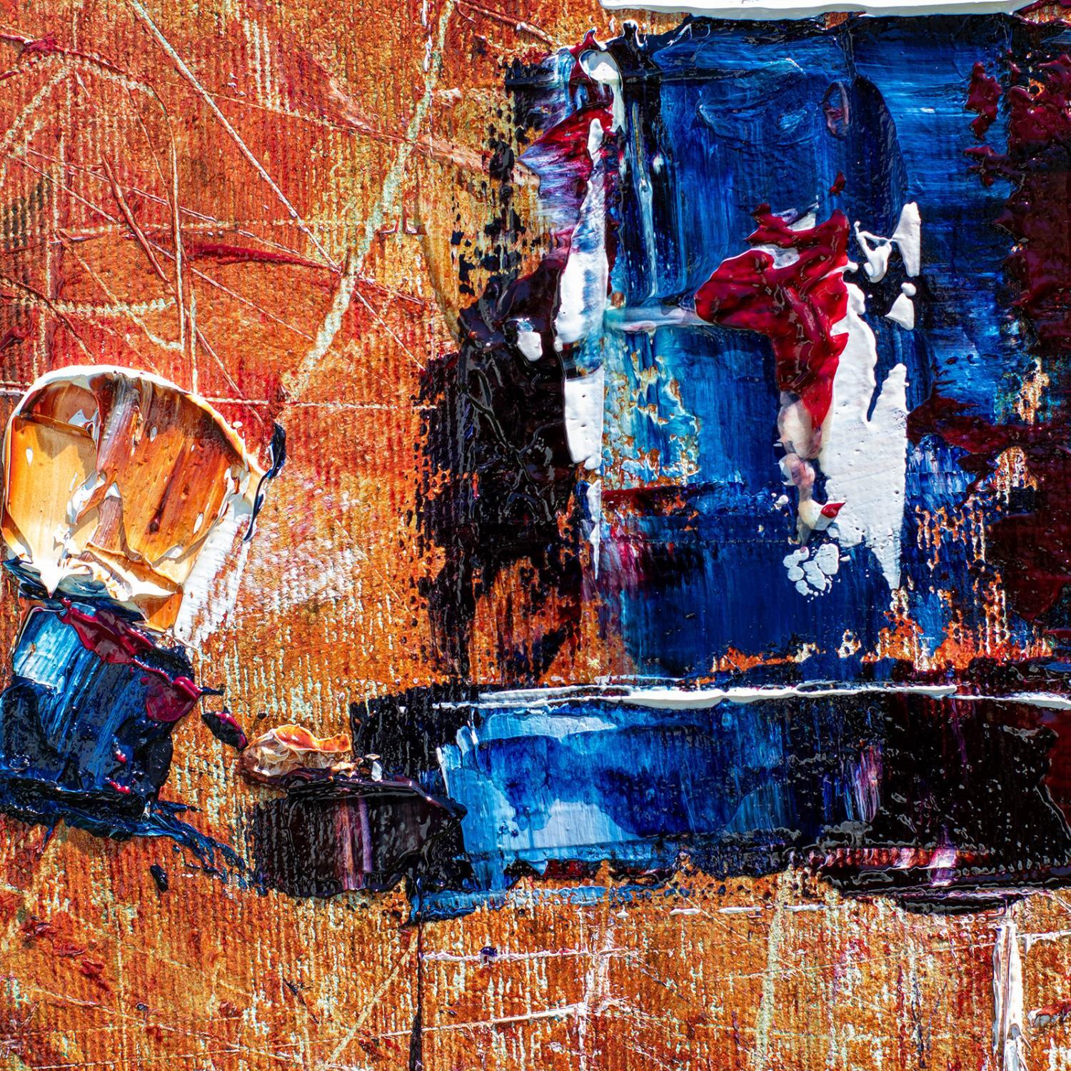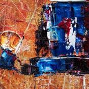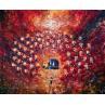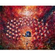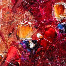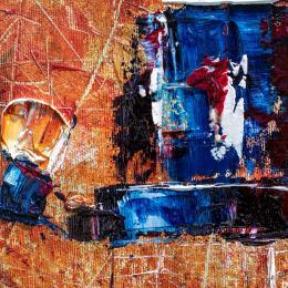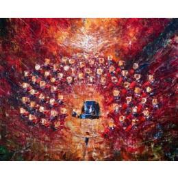 Le concert avec pianiste is a work that oscillates between abstraction in the periphery and naive art in the center and the representation of the instrumentalists. The motif is painted in knife and oil, and plays on a harmony of warm colors (shades of red, orange) and metallics (gold, copper, silver...). The square heads of the figures are inspired by Nicolas de Staël's "Parc des Princes" series. The staging highlights the central pianist, playing on circularity (the formation) and verticality (the background). The conductor, isolated and in a masterly posture, concludes the lower part of the work. The overall tone is flamboyant or baroque... depending on your sensibilities.