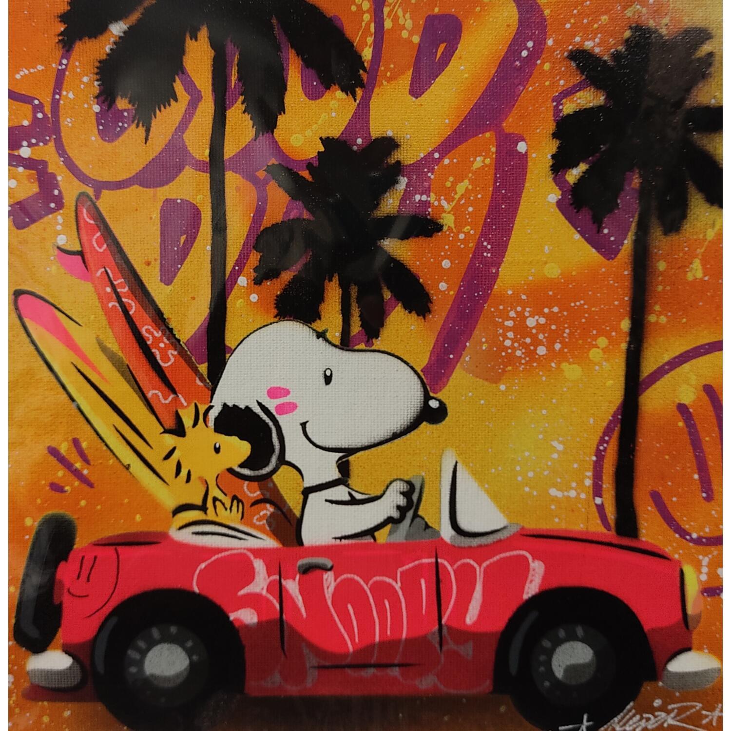 This unique and original contemporary artwork "Snoopy voiture surf 5" on the subject of Pop icons has been created by the contemporary artist Lemoine Mael.