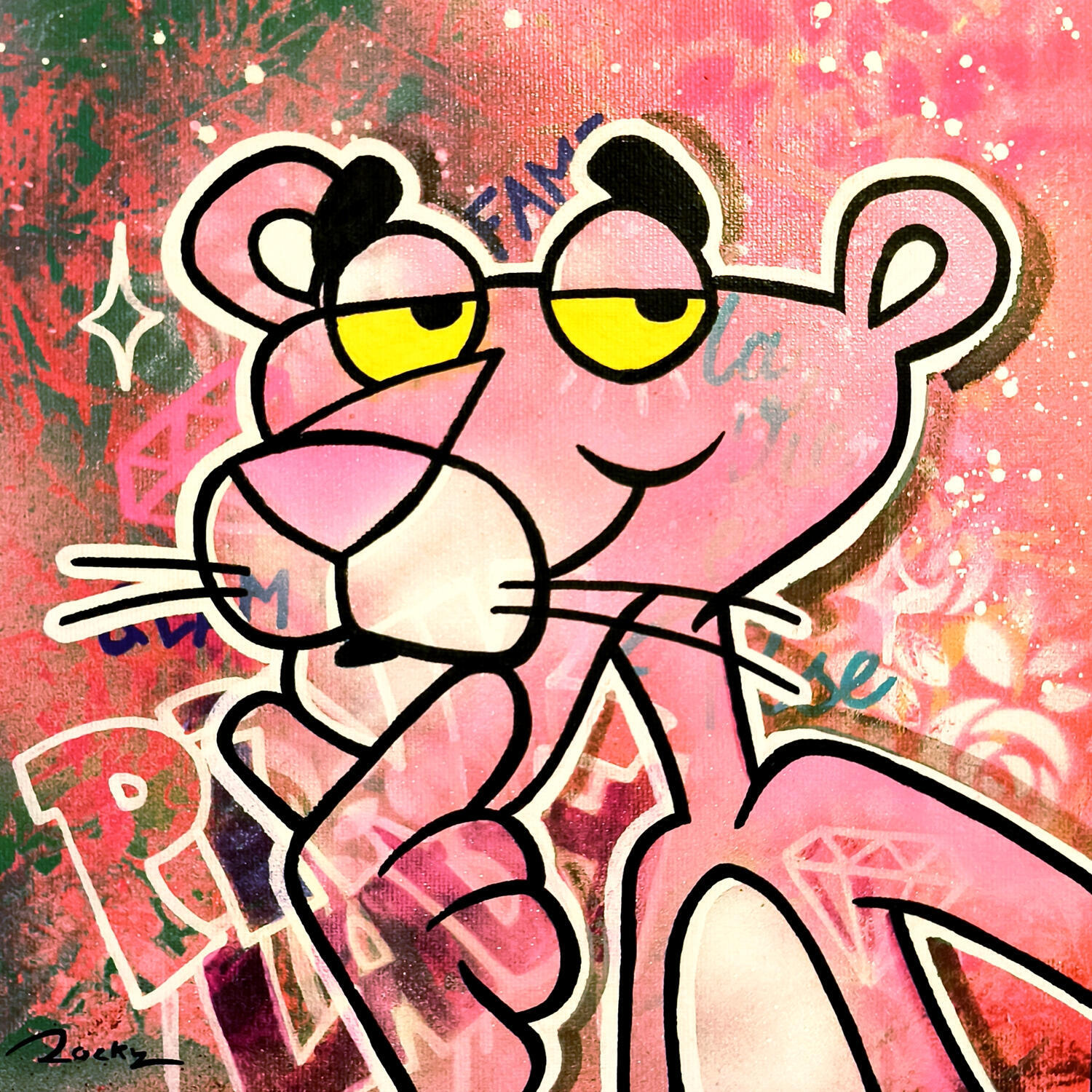 This unique and original contemporary artwork, "Pink Lady," was created by contemporary artist Rocky Chaplin. The artist used various techniques to create this small-format painting with its distinctive style.